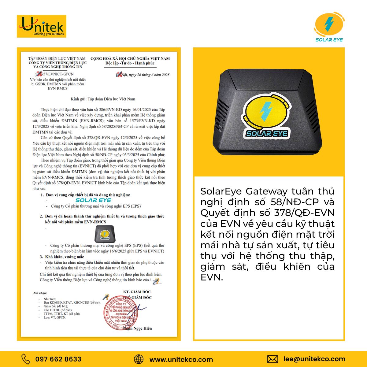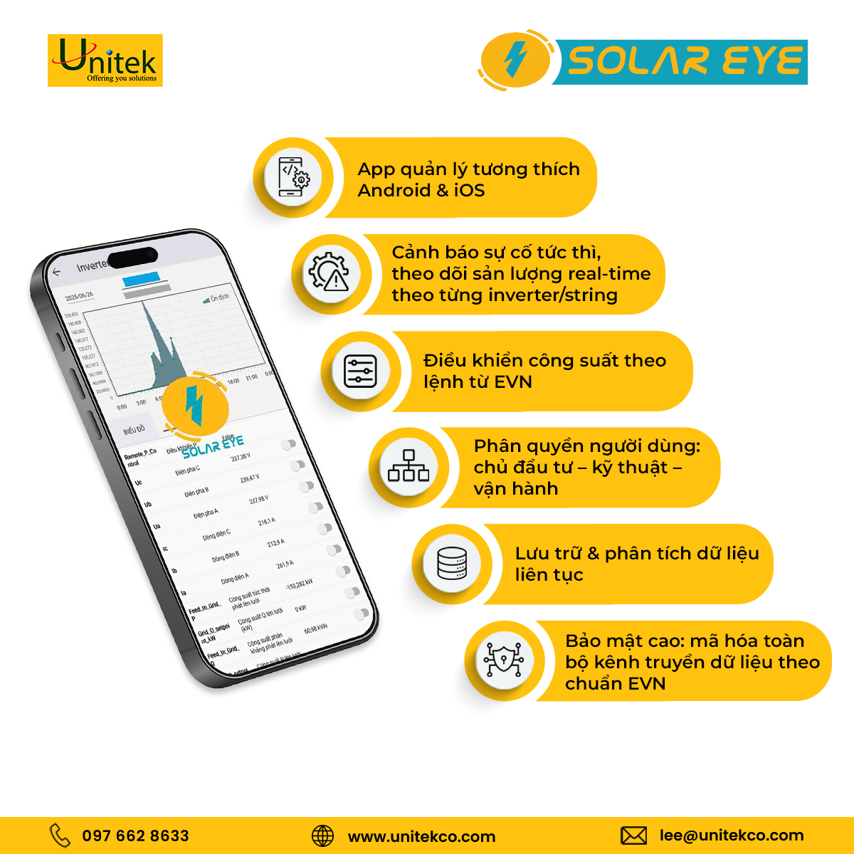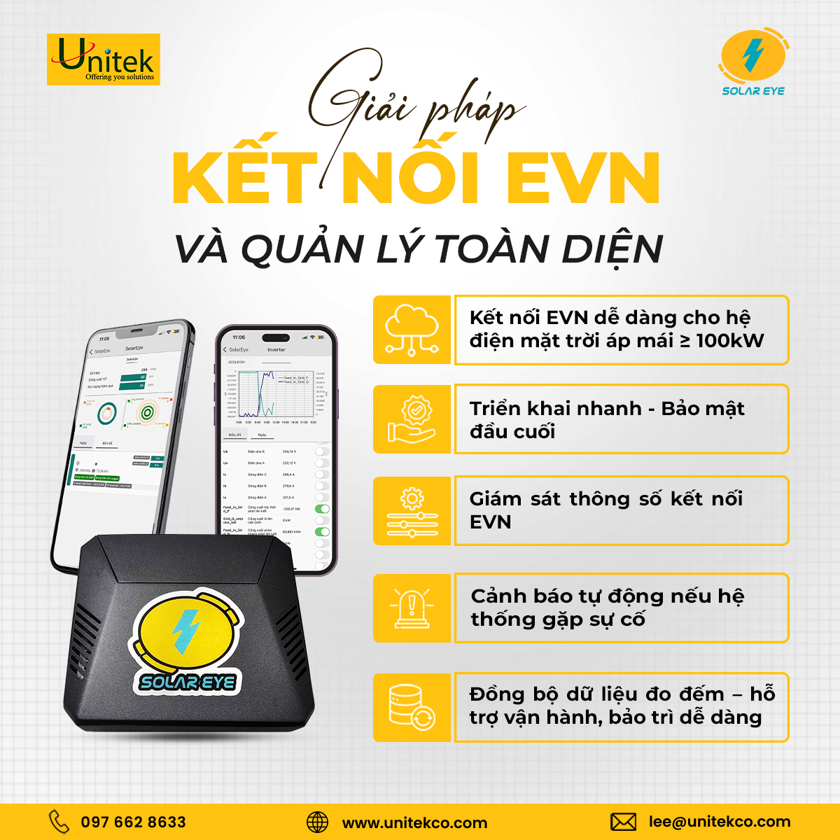 Trong bối cảnh điện mặt trời ngày càng phát triển mạnh mẽ, việc đáp ứng yêu cầu kết nối với EVN và quản lý hệ thống một cách hiệu quả, an toàn đang là mối quan tâm hàng đầu của các nhà đầu tư. Với Solar Eye, Unitek mang đến giải pháp tối ưu giúp chủ đầu tư yên tâm vận hành, tuân thủ quy định, đồng thời tiết kiệm thời gian và chi phí.